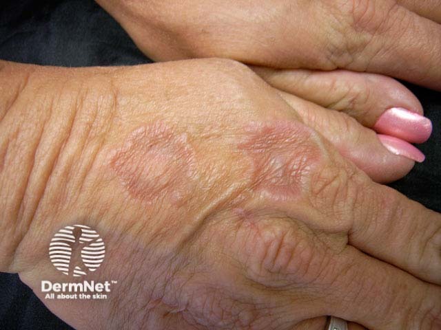 Granuloma annulare is very persistent. The lesions slowly appear, evolve and disappear over weeks to months or years. They may arise predominantly over joints and extensor surfaces, or instead favour flexural sites. They are not scaly as the plaques are due to dermal granulomatous inflammation, like sarcoidosis and leprosy (which may cause similar annular plaques).