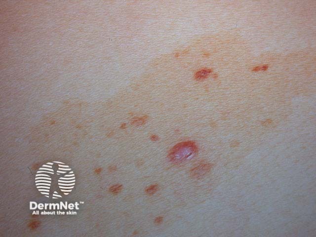Speckled lentiginous naevus presents with darker macules and papules within a flat light brown patch. It is a type of congenital melanocytic naevus, but may present in childhood. The number of darker spots tends to increase with age.