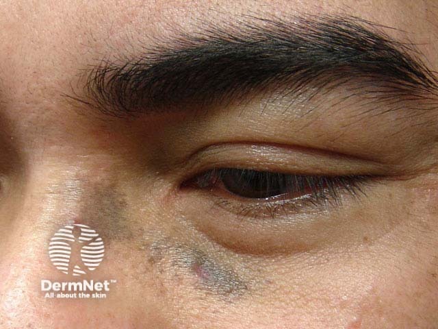 Naevus of Ota describes a blue or grey dermal naevus on the face, often also involving the cornea. It is usually congenital but sometimes arises in adolescence