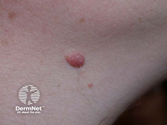 Dermal or cellular naevi are protuberant moles. They are soft or firm, dome-shaped, pedunculated or papillomatous. They are often flesh coloured but may be tan or dark brown in colour. In dark skinned individuals they may appear almost black. Histologically, naevus cells are confined to the dermis.