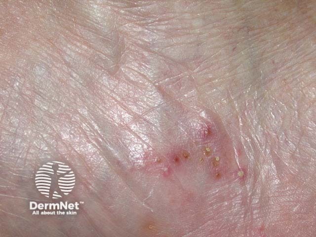Localised clusters of vesicles and pustules on the side of the foot may be due to dermatophyte infection, usually Trichophyton interdigitale. Infection should be confirmed by scrapings for mycology.