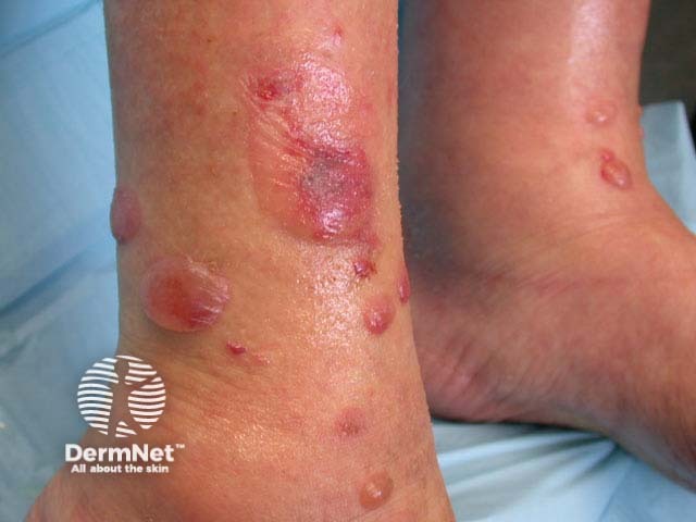 Bullous pemphigoid is a common immunobullous disease affecting the elderly. Large tense blisters arise in normal skin or within eczematous or urticated plaques and may be localised or, more frequently, generalised. They are quite common on the feet, but are more often found around flexures.