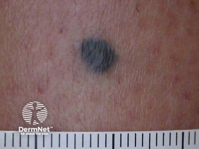 Dermoscopy reveals a uniform steel-blue colour, sometimes with central or peripheral brown blotches.