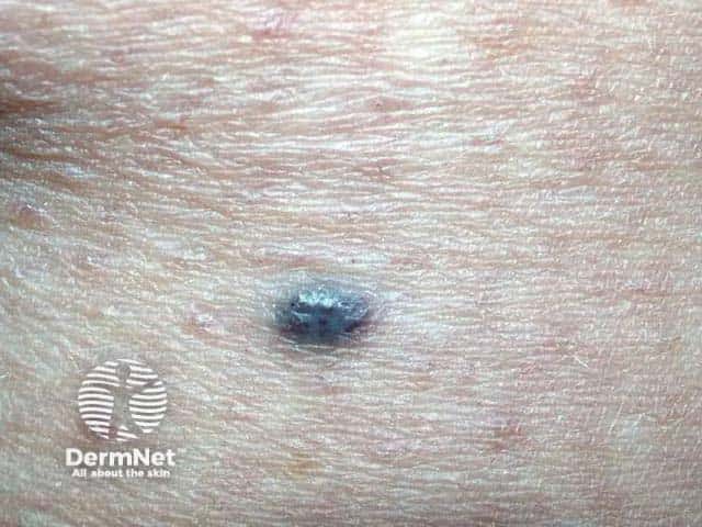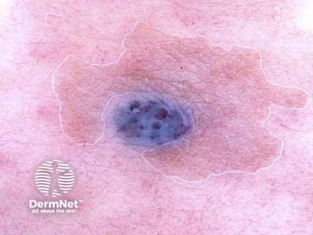 Blue skin lesions may be due to melanocytic lesions, vascular lesions or exogenous pigment. Dermoscopy may be useful to distinguish them.