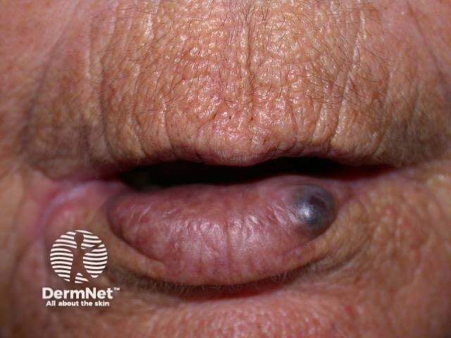 A bluish or purple vascular nodule on the lip is a venous lake, and is also compressible.