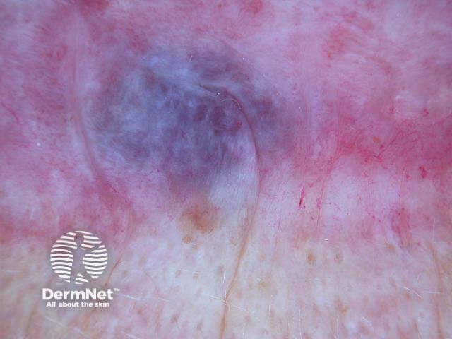 Blue skin lesions may be due to melanocytic lesions, vascular lesions or exogenous pigment. Dermoscopy may be useful to distinguish them.