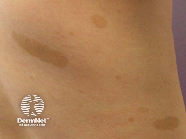 Melanocytic naevi may be congenital or appear in early childhood (congenital type); there are several distinct varieties. The café-au-lait macule is a well-demarcated light brown patch. Histologically, these have nests of naevus cells along the dermoepidermal junction. The naevus cells have variable-sized melanosomes including macromelanosomes. Neurofibromatosis is characterised by multiple café au lait macules, but these may also be seen sporadically and as a feature of other neurocutaneous disorders, including Albright’s syndrome and tuberous sclerosis. A café-au-lait macule with darker spots is known as speckled lentiginous naevus or naevus spilus – this is usually solitary.