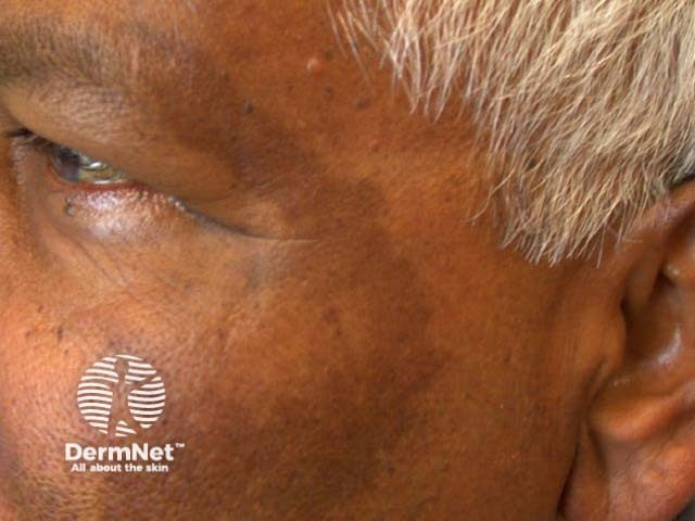 Melasma presents as a symmetrical tan or dark patchy discolouration of the forehead, cheeks, upper lip and jawline. It is more common in females, particularly in association with pregnancy and exogenous progesterone. There is genetic predisposition and it is significantly aggravated by sun exposure. Rarely, it arises on the arms, where it is called Acquired Brachial Cutaneous Dyspigmentation (ABCD). Histologically, there is increased melanin in the epidermis and/or the dermis, with more active but not more numerous melanocytes.