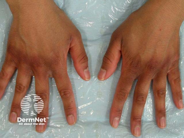 Postinflammatory pigmentation (epidermal type) following irritant hand dermatitis.