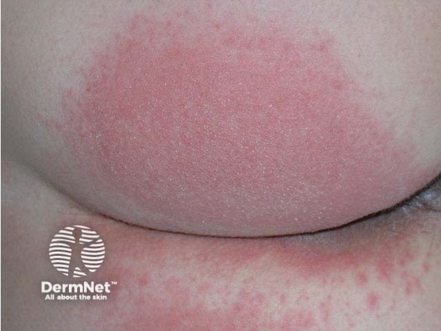 A patient with longstanding pruritus ani presented with a dramatic rash on the buttocks. Although the patient blamed new underpants, patch tests were strongly positive to benzocaine, a local anaesthetic component of an over-the-counter haemorrhoid cream the patient had been using.