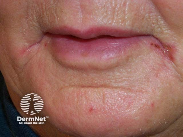 Intermittent and irregular itching, soreness, swelling and blistering may be due to contact allergy; this tends to affect adjacent skin. A thorough history is required prior to patch testing to identify potential allergens. These include metals, fragrances and preservatives and may be found in lipstick, other cosmetics, musical instruments, toothpaste and mouthwashes, rubber balloons and food.