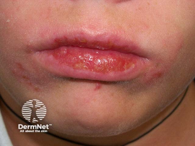 Intermittent and irregular itching, soreness, swelling and blistering may be due to contact allergy; this tends to affect adjacent skin. A thorough history is required prior to patch testing to identify potential allergens. These include metals, fragrances and preservatives and may be found in lipstick, other cosmetics, musical instruments, toothpaste and mouthwashes, rubber balloons and food.