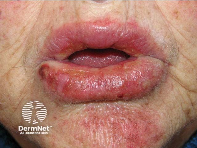 Intermittent and irregular itching, soreness, swelling and blistering may be due to contact allergy; this tends to affect adjacent skin. A thorough history is required prior to patch testing to identify potential allergens. These include metals, fragrances and preservatives and may be found in lipstick, other cosmetics, musical instruments, toothpaste and mouthwashes, rubber balloons and food.