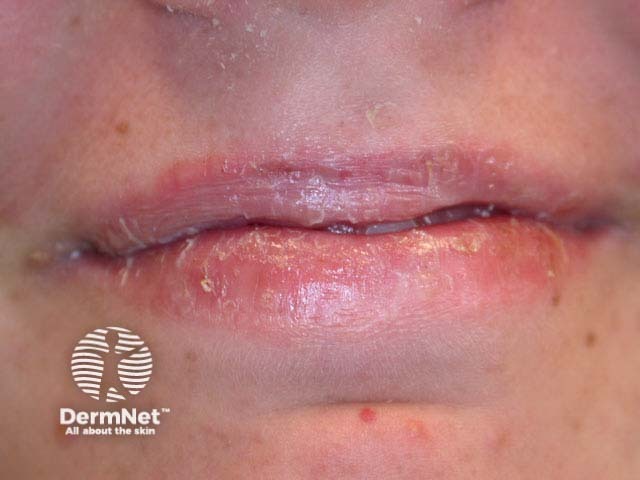 Intermittent and irregular itching, soreness, swelling and blistering may be due to contact allergy; this tends to affect adjacent skin. A thorough history is required prior to patch testing to identify potential allergens. These include metals, fragrances and preservatives and may be found in lipstick, other cosmetics, musical instruments, toothpaste and mouthwashes, rubber balloons and food.