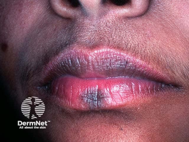 This patient has had a blister on his lip, which has left deep pigmentation. This is typical of fixed drug eruption, due to intermittent ingestion of a systemic medication. The lip is a common site.