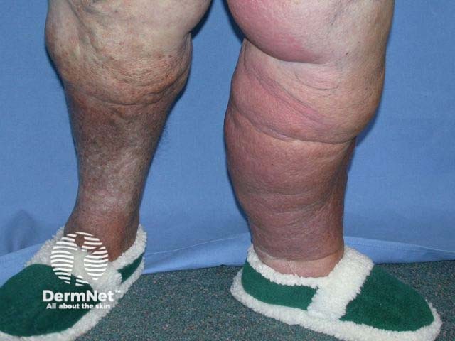 Venous disease is also common in obese subjects due to obstruction to venous return. The image demonstrates the classical ‘champagne-bottle’ leg. Note hyperpigmentation, dermatosclerosis, dryness, varicosities of the right leg. The left leg is swollen and red with lymphoedema and cellulitis. Bacterial infection is a common complication of venous disease, but is particularly prevalent in obesity and type 2 diabetes.
