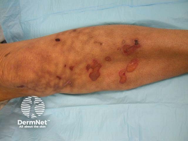 This patient presented with angulated bullae and necrotic scars on her left shin. Note a pigmented network, which is characteristic of erythema ab igne. The blistering was caused by heat injury and arose because of diabetic neuropathy.