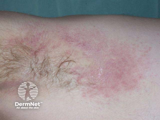 Intertrigo arises because of heat, moisture and friction. The patient illustrated suffers from hyperhidrosis; wet clothing causes chafing. Note sparing of the axillary vault.