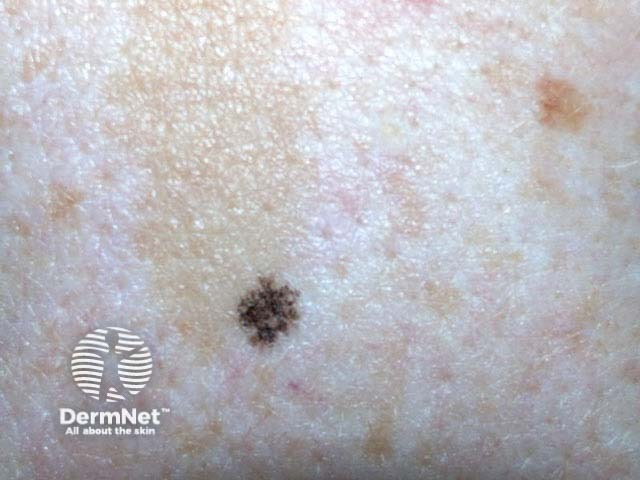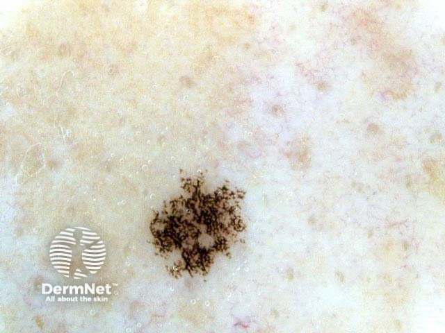 This lesion has two components. There is a well demarcated tan macule with homogenoues pigmentation on dermoscopy. There is also a dark freckle, which has a regular dark-brown pigment network. There are no features to suggest melanoma. This is an ink-spot lentigo.