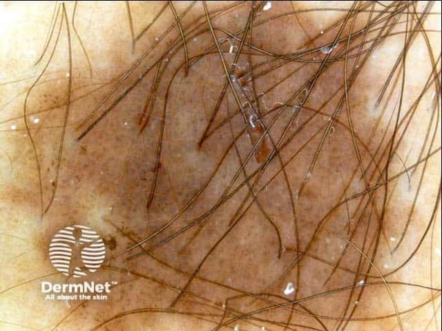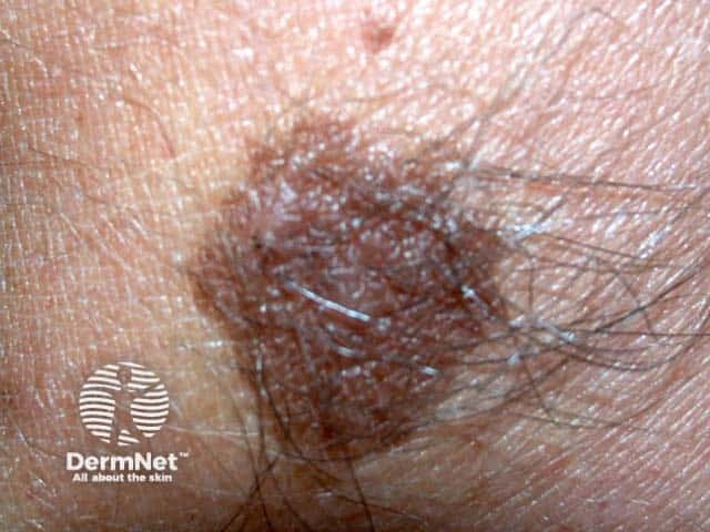 The clinical view is quite typical of a congenital naevus; a large uniform thickened and hairy mole. The dermoscopic features show a symmetrical lesion that is composed of aggregated globules, in areas appearing like cobblestones. There are a few regular brown dots. A subtle blue-white colour is seen over the central part of the lesion.