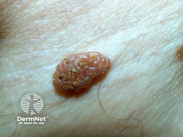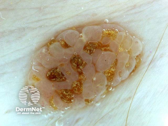 This is a dermal naevus that has lost its pigmentation and consists of lobules separated by crypts filled with keratin. Uniform comma-shaped blood vessels are visible.