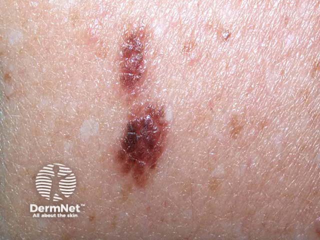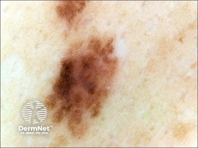 This is a melanocytic lesion with an atypical pigment network and some asymmetric blotches. There ae very few scattered dots. Histologically it was a dysplastic compound naevus. The patient had many clinically similar lesions.