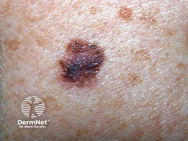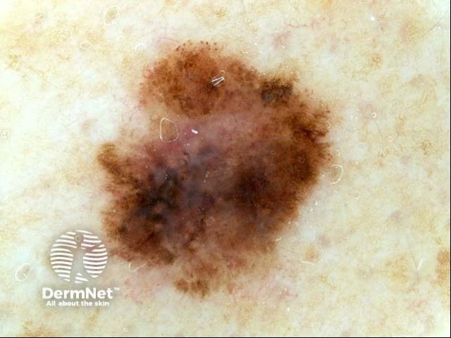The dermoscopic features include a multicomponent pattern (atypical pigment network, asymmetric blotches and irregular dots and globules), focal irregular streaking (radial streaming), blue-white veil over part of the lesion, blue pepper-like granules, irregular vascularity and localised negative network.