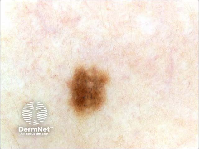 This is a melanocytic lesion with a fairly uniform diffuse fine pigment network. There are scattered centrally distributed bluish globules representing focal areas of dermal nests. There were no features of concern and the lesion has not been excised.