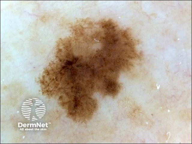This was dermoscopically a worrying lesion because of asymmetry, an atypical pigment network and irregularly distributed dots. However the histology, which was reviewed, revealed a benign lesion.