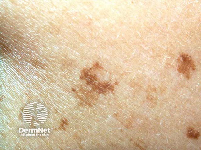 This lesion has an irregular shape but is composed of a regular dark-brown pigment network. The edges appear somewhat moth-eaten. There are no features to suggest melanoma. It is a freckle.