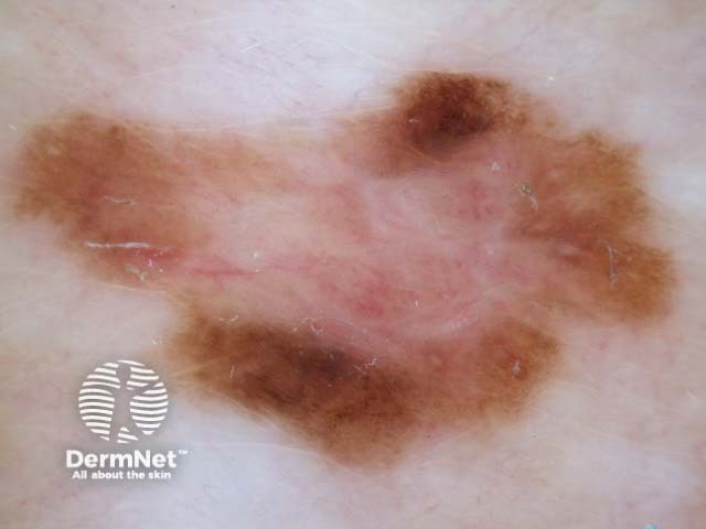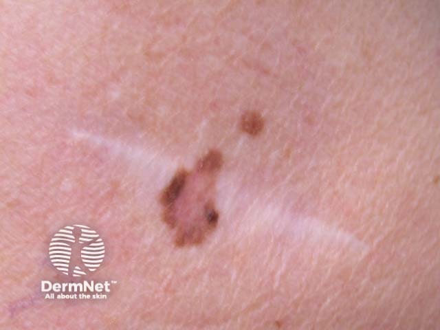 The macroscopic view is of an irregular pigmented lesion arising in the middle of a surgical scar. Dermoscopy shows irregular peripheral pigmentation with network, amorphous areas and a few clustered dots. The histology was benign, despite the worrying clinical features.