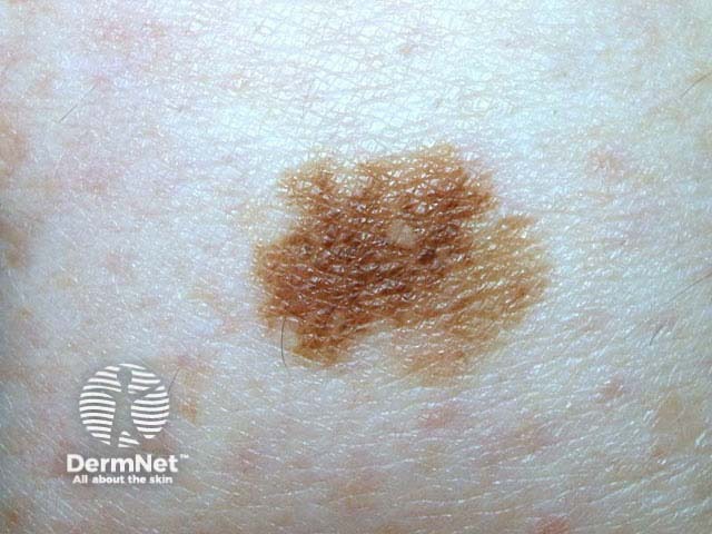 The patient reported recent change in a large irregular freckle on her knee. Dermoscopy reveals asymmetry of colour and structure. Pigment network is not clearly seen but may be present at 7 o'clock.