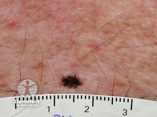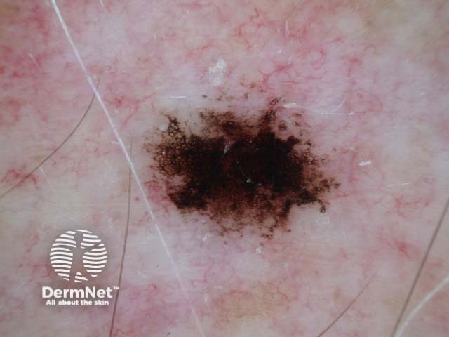 This is a very dark lesion with an irregular outline. Dermoscopy shows a dense pigment network with no specific features of melanoma. It was a stable lesion.