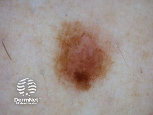 The naevus has a prominent dark area. Dermoscopy reveals an atypical pigment pattern and irregular blotches. Histology was benign, and the patient had several other similar lesions.