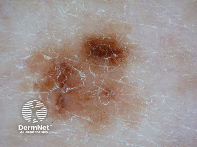 The lesion has changed in appearance between October 2002 and March 2004. The dermoscopy in March 2004 revealed an irregular lesion with asymmetric blotches of varying shades of brown. There is no distinct network pattern, but there are a few irregular dots at 1 o'clock.
