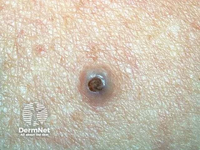 The patient presented with a dark nodule on her back. Close inspection revealed a large open comedo. The dermoscopy reveals a round bluish lesion with a prominent keratinous core.