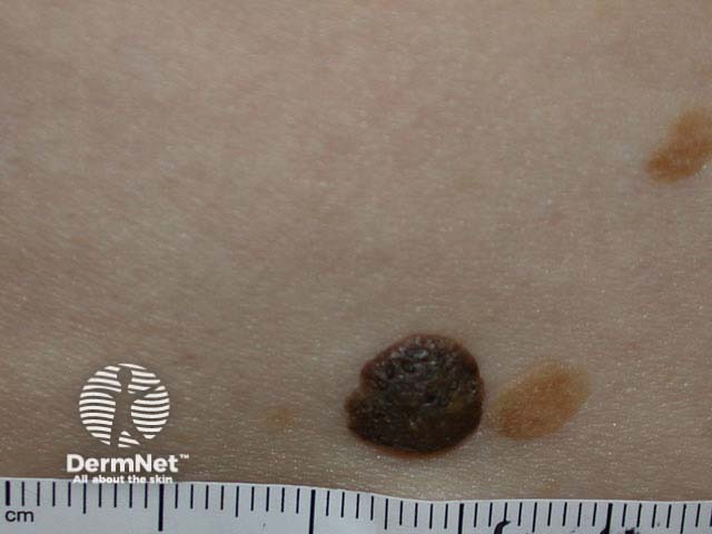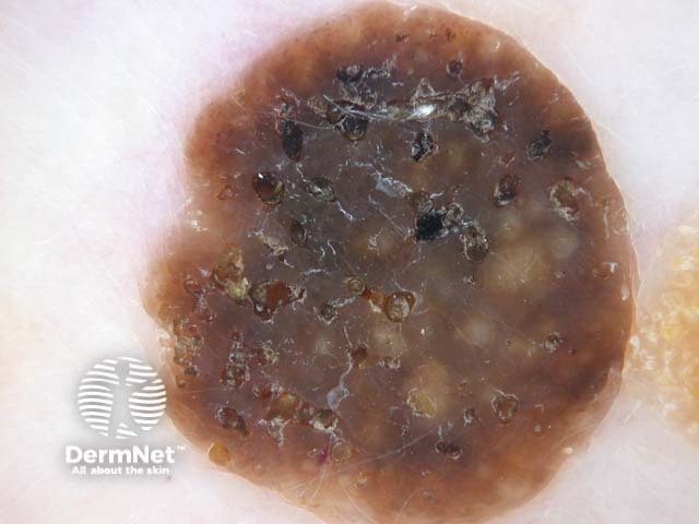 The lesion shows no melanocytic features on dermoscopy (pigment network, aggregated globules or uniform amorphous pigmentation). The lesion has a clear cut margin. There are multiple milia-like cysts, comedo-like openings.