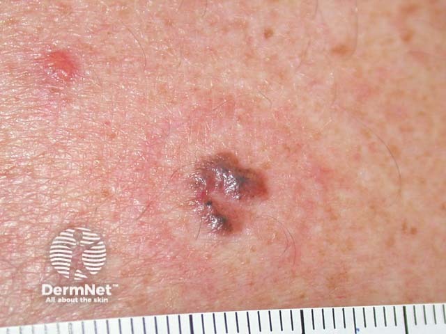 The clinical view shows a shiny irregular pigmented plaque. There are no melanocytic features on dermoscopy (pigment network, aggregated globules or uniform amorphous pigmentation). Vascularity is irregular but there are no arborising vessels. There are large blue ovoid masses, irregular clusters of blue and brown dots and brown leaf-like areas. There is no ulceration.