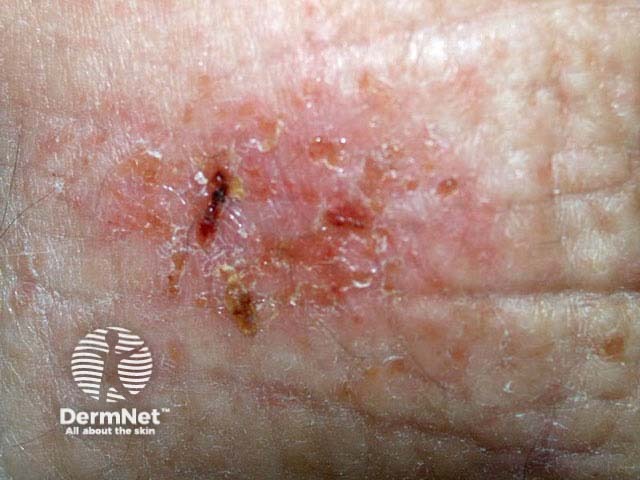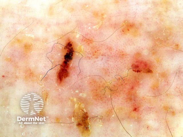 The clinical view is of an eroded ill-defined erythematous and scaly plaque. There are no features of a melanocytic lesion on dermoscopy. There are yellow keratinous areas, erosions and a distinctive irregular ‘glomerular’ pattern of vascularity.
