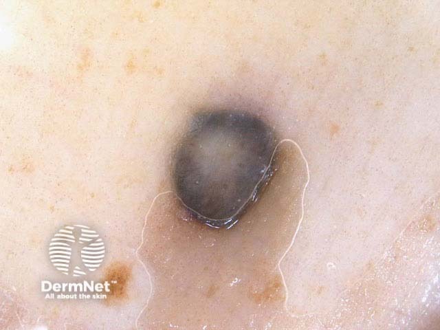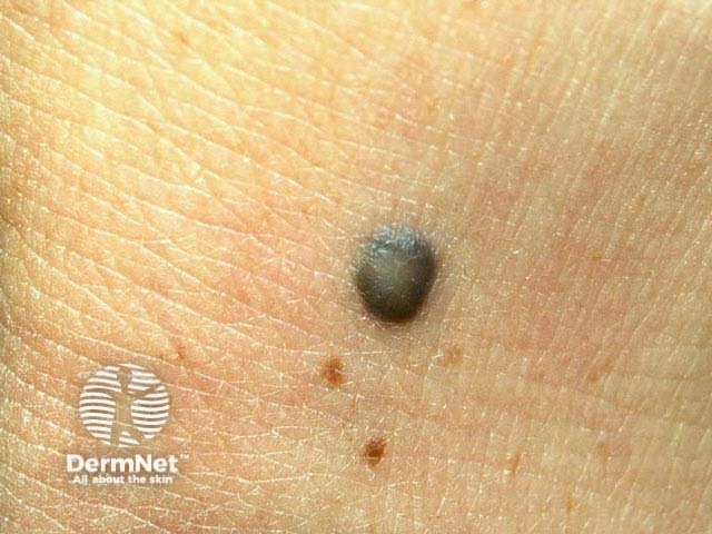 The clinical view shows a well-defined dark blue oval nodule. The lesion shows a symmetrical amorphous pigment on dermoscopy, with steel grey, brown and light brown components. The appearance is characteristic of a benign blue naevus.