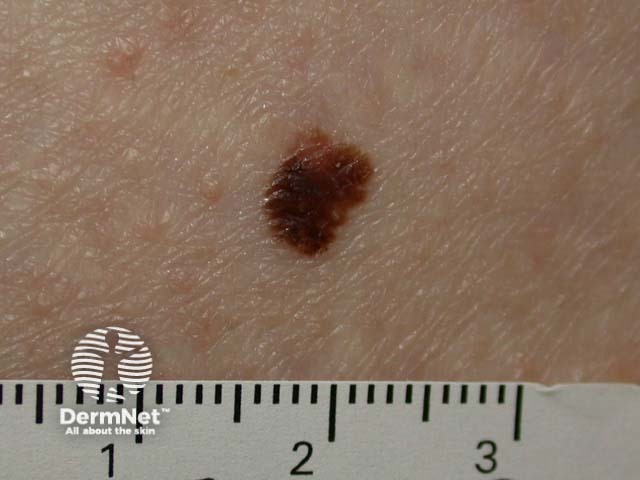 This is pigmented lesion with variation in colour and slightly irregular border. Dermoscopy reveals an atypical pigment network and irregular blotches. There are focal irregular streaks.