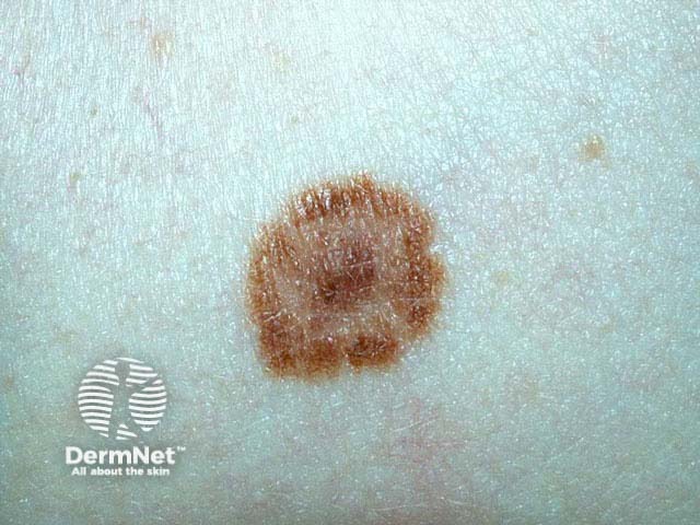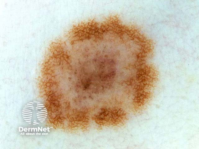 This naevus has a striking targetlike pattern with peripheral and central dark areas separated by a paler ring. The dermoscopy reveals a symmetrical and uniform peripheral network, amorphous ring, and globular central area.