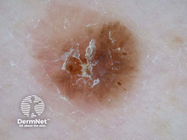 The clinical picture is of a 6 mm diameter, slightly irregular, tan brown lesion with a slightly dry surface. Dermoscopy is non-specific. The characteristic features of seborrhoeic keratosis and pigmented basal cell carcinoma are absent, so it must be considered a melanocytic lesion. There is no pigment network, but there are irregular amorphous areas. There is a cluster of brown dots at 9 o'clock and solitary large globules at 2 and 4 o'clock.