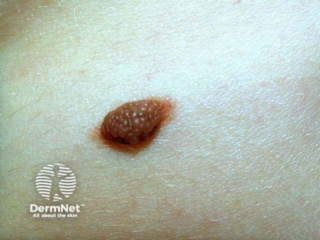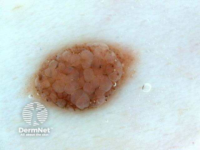 The lesion is composed of regular pale brown lobules, the typical papillomatous structure of a dermal naevus. There is no pigment network and only small numbers of scattered peripheral dots. Some of these may represent small crypts.
