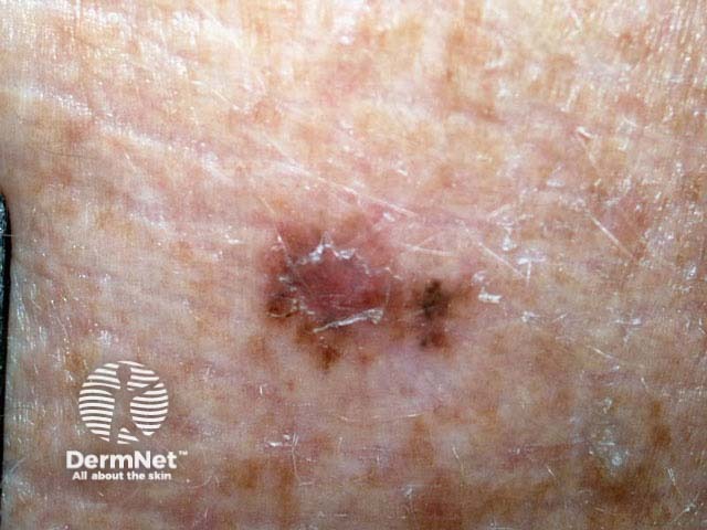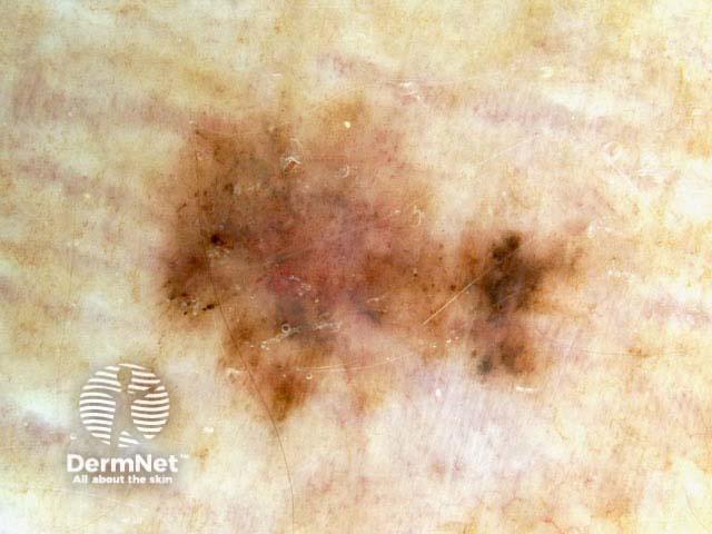 The clinical view shows an irregular pigmented plaque. Dermoscopically, there is a multicomponent pattern with an atypical pigment network; irregularly distributed brown, grey and black dots; and asymmetrical blotches. There is focal radial streaming (6 o'clock) and irregular dotted vessels.