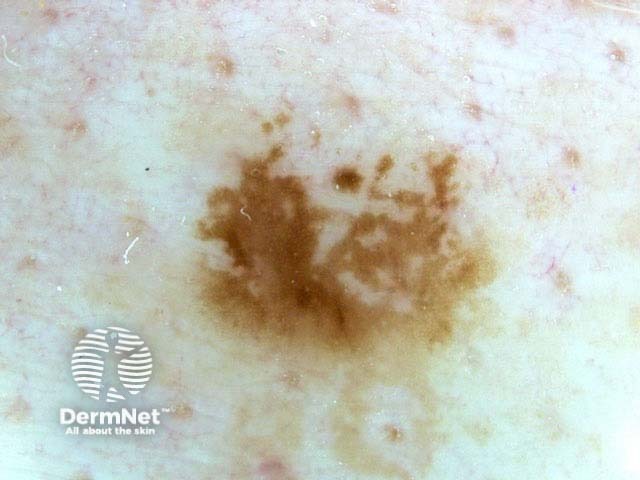 Close inspection reveals a fine network pattern in this evenly pigmented but odd-shaped freckle. There are no features to suggest melanoma.