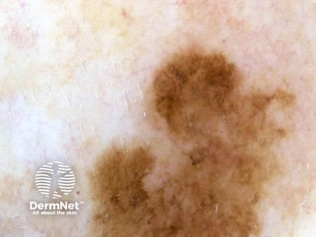 The clinical view is of a large odd-shaped freckle. The dermoscopy reveals an indistinct atypical network and possible focal irregular streaking.