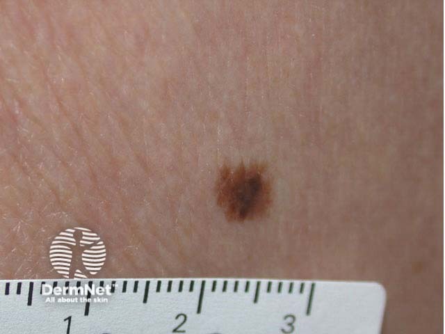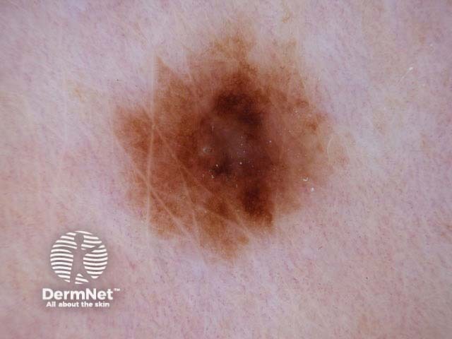 This is a 5 mm pigmented lesion with a notched border. There is network has minimal atypical features and there is a suggestion of blue-grey veil centrally.