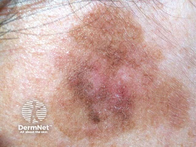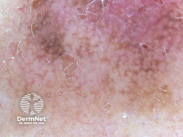 The clinical view shows a very large pigmented patch on facial skin. The dermoscopy shows some areas of pale brown pigment, asymmetric pigmented follicles and rhomboid structures. There is increased vascularity in the affected area.