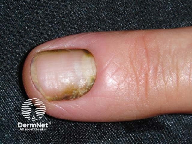 Although acute paronychia is bacterial (Staphylococcus aureus) or viral (Herpes simplex), chronic paronychia is often associated with Candida albicans. The nail fold is inflamed and lifted away from the nail plate; the nail plate may become ridged and yellow, green or black in colour.